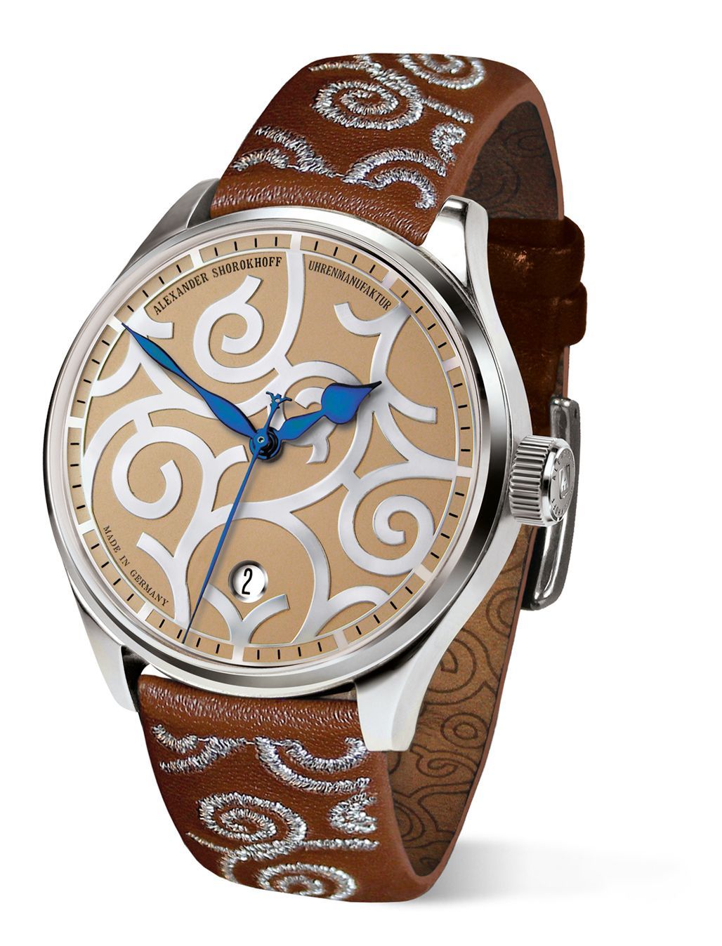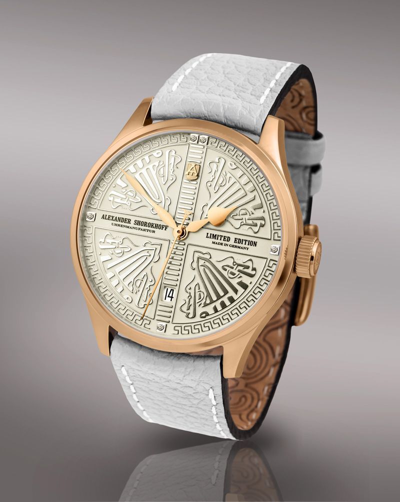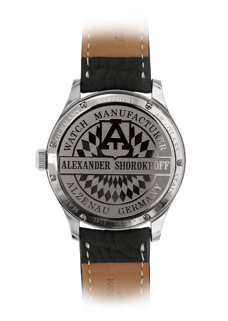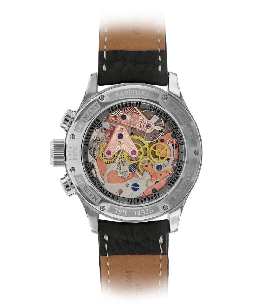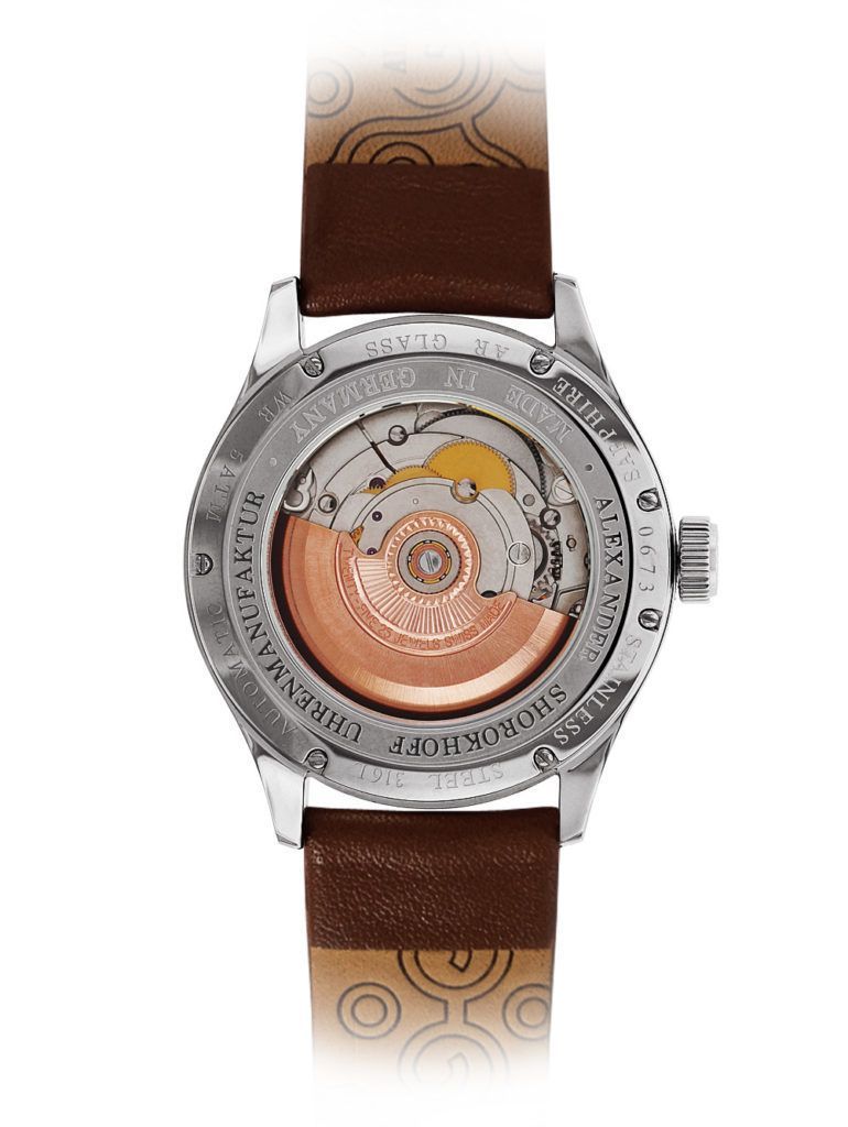 Im Inneren der Uhr tickt das Schweizer Uhrwerk ETA.2671 mit automatischem Aufzug. Der Rotor des Werks wurde, wie bei Alexander Shorokhoff üblich, handgraviert. Limitiert auf nur 30 Stück weltweit.