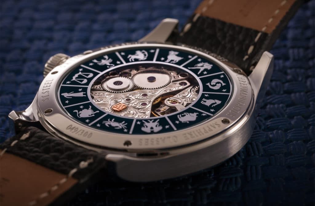 Diese kulturelle Faszination Babylons wird hier aufgegriffen. Die Platine des Werkes und der äußere Ring des Zifferblattes werden in einem hochkomplizierten Verfahren per Hand filigran ausgearbeitet und dekorativ gestaltet. Zusammen mit dem Stundenring aus dunkelblauem Perlmutt mit aufgedruckten Tierkreiszeichen, den gebläuten Zeigern und der Stundenmarkierung entsteht ein faszinierendes Bild. Auch auf der Rückseite der Uhr kann man sich an den meisterhaften Gravuren erfreuen.
