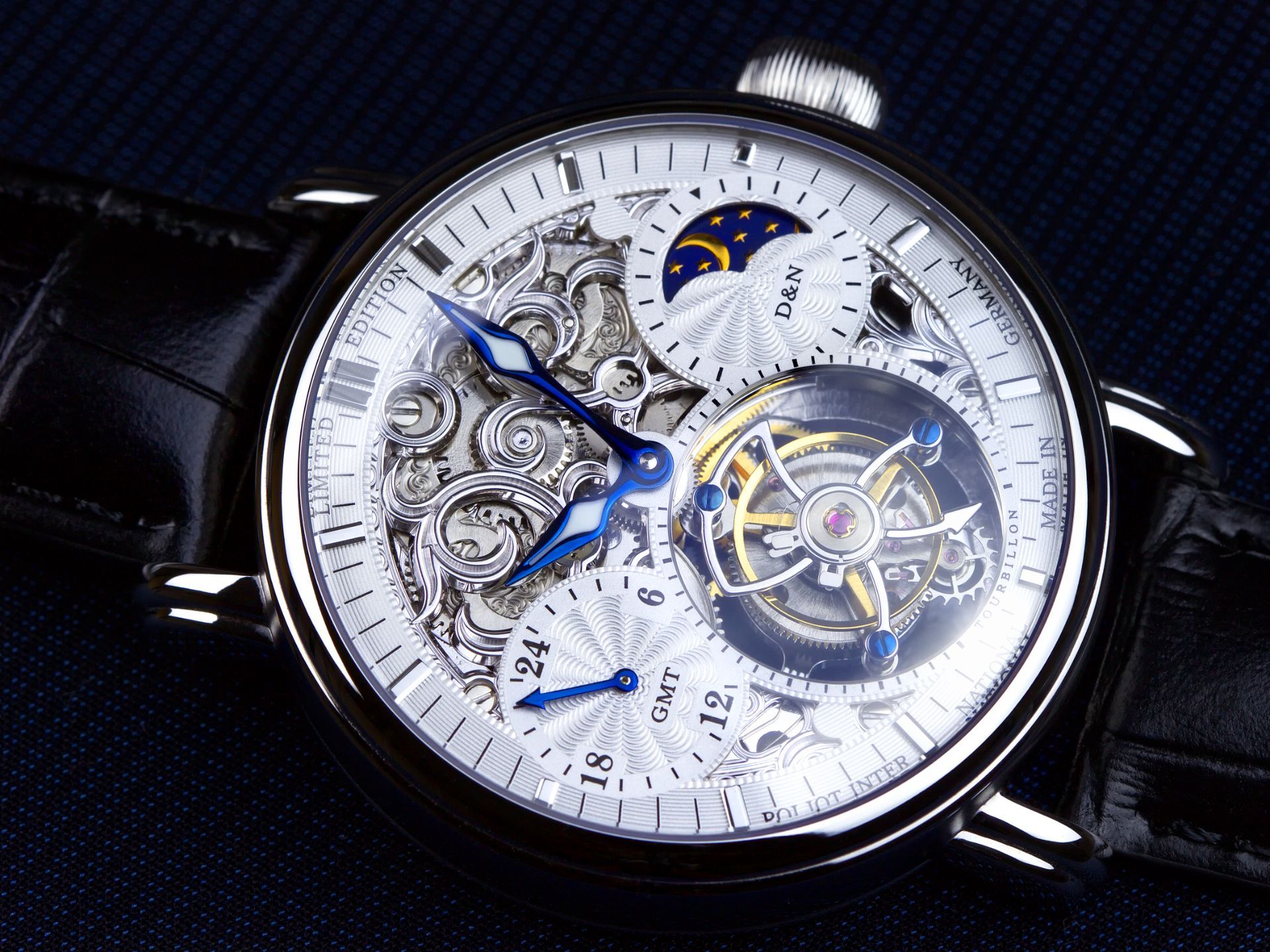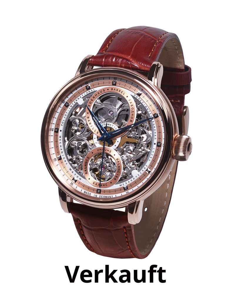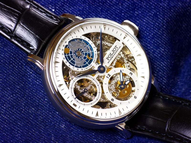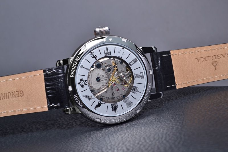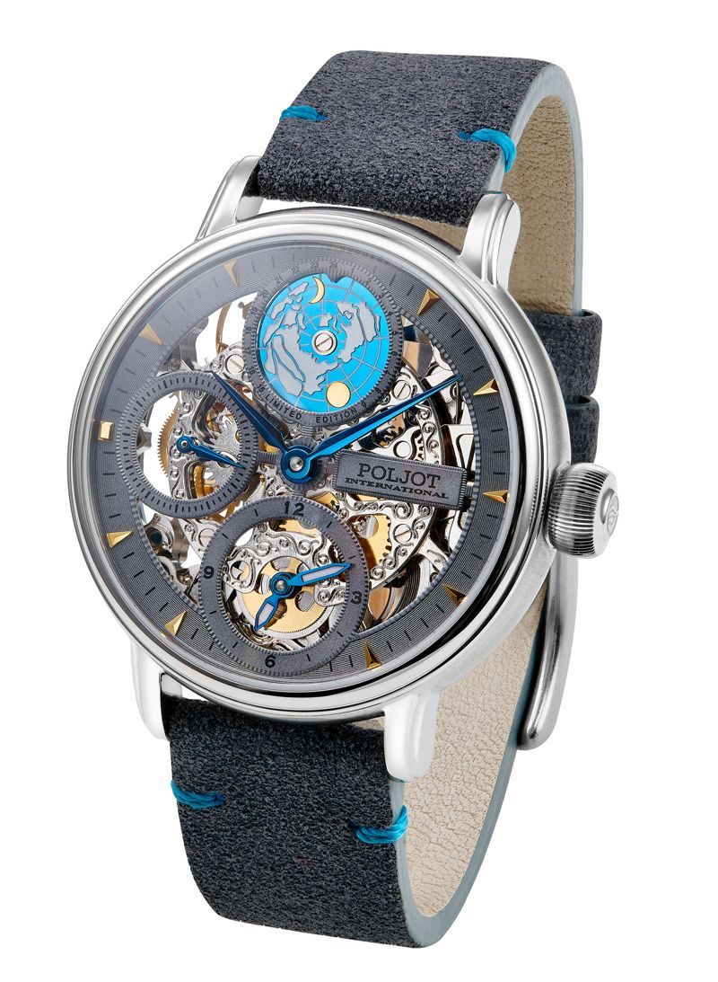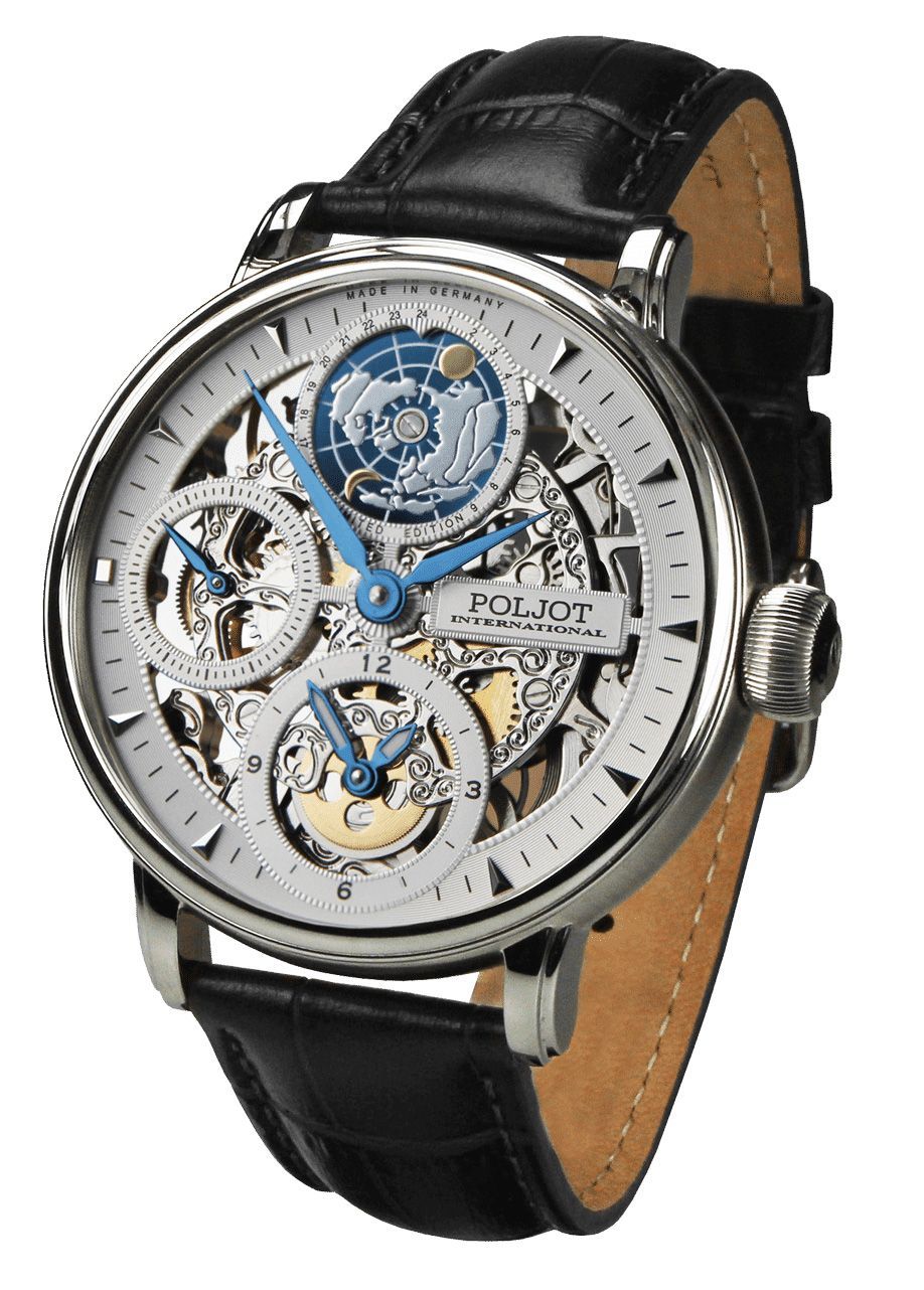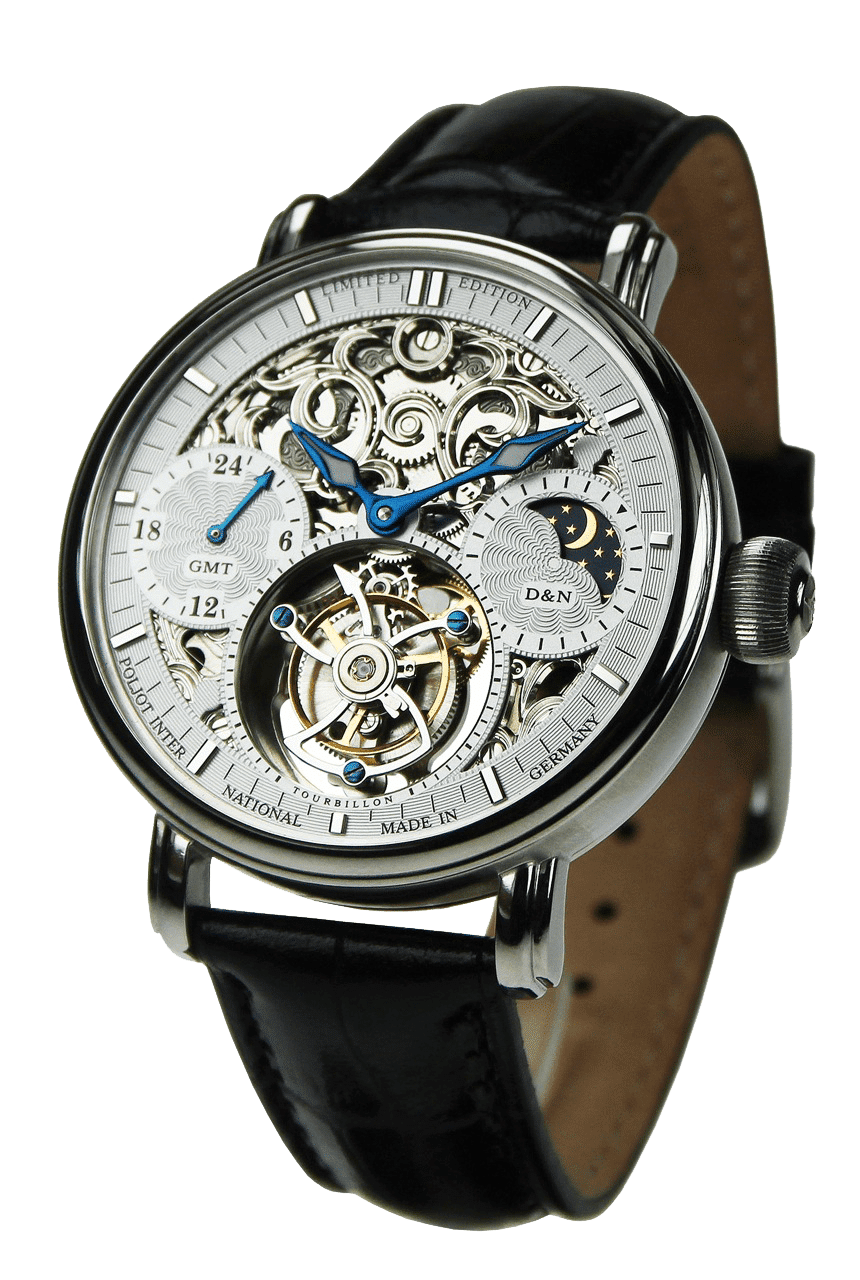 Das Doubletimer – Model „Globetrotter“ in skelettierter Ausführung ist der perfekte Begleiter für international Reisende, die etwas Ausgefallenes mögen.