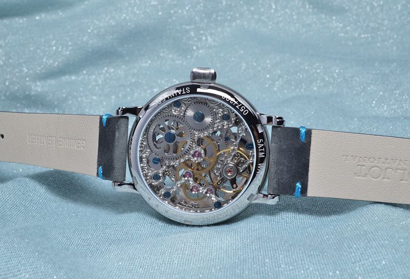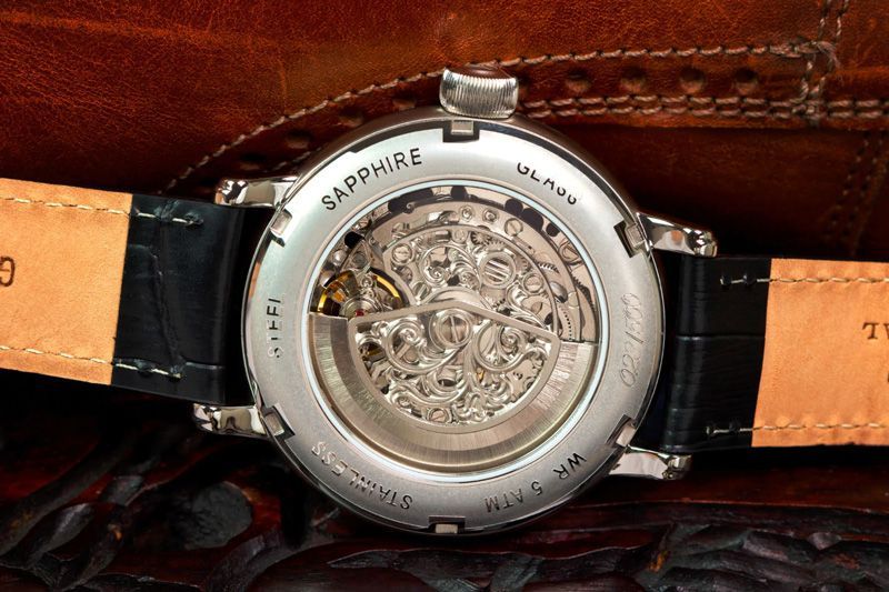 Eben diese Kunstwerke bildeten die Inspiration bei der Gestaltung des Designs dieser Automatikuhr: Klassisch & künstlerisch skelettiert zeichnet sich der Skeleton durch eine Mischung von traditionellen Arabesken, sowie runden und geschwungen Formen aus. Die sich im Mittelpunkt der Uhr befindlichen Ringe, offenbaren einen Blick auf die Unruh und das Federhaus, die durch skelettierte Rotoren vervollständigt werden.