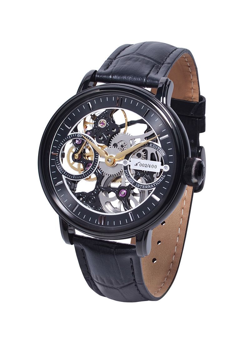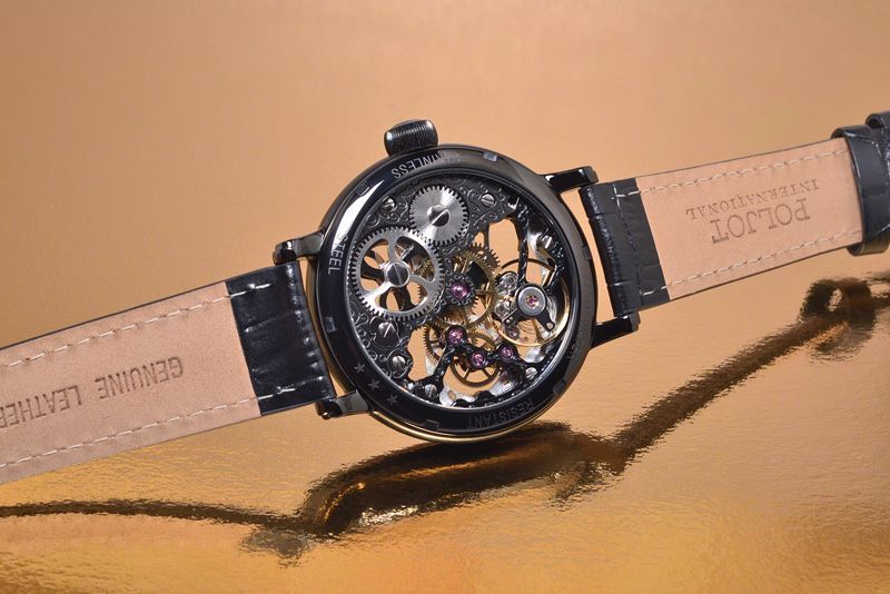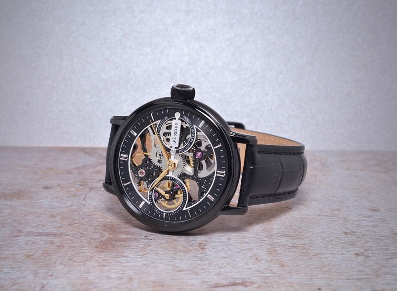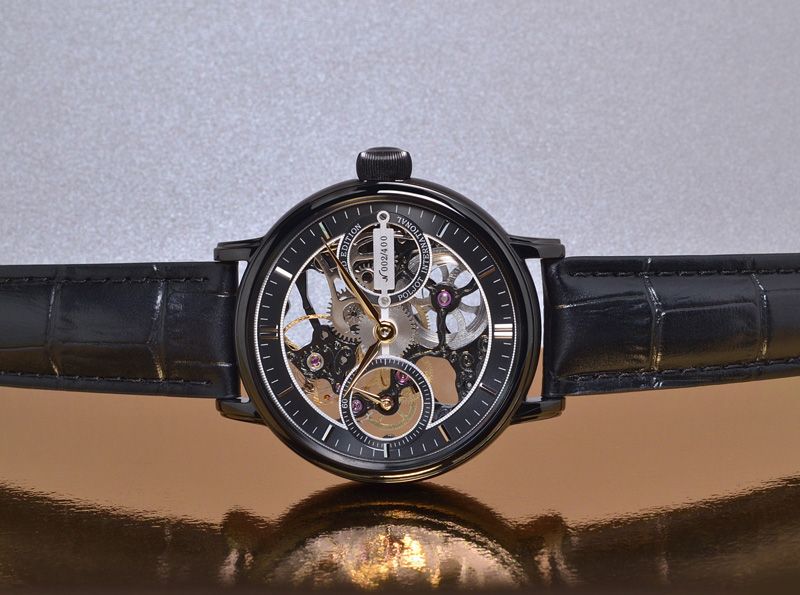 Mit schwarzem Zifferblatt und schwarzem PVD-beschichtetem Gehäuse überzeugt die modernste Version auf ganzer Linie. Gelbgoldene Zeiger und einige gelbgoldene Komponenten des skelettierten Uhrwerks lassen dieses Modell ebenso luxuriös und erhaben wirken.